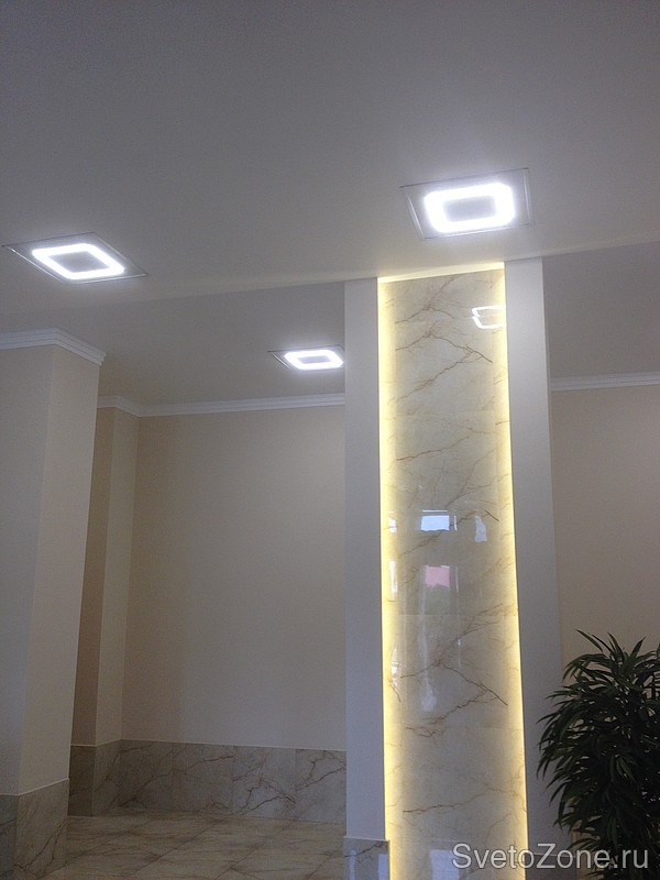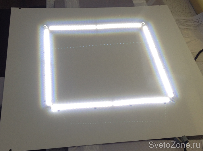 Конструктив светильника представляет собой лист-задник с порошковой окраской белого цвета. На листе установлены 4 линейки со светодиодами в форме квадрата, по контуру закрытыми матовыми стеклами с присадкой (светопропускание до 92%)