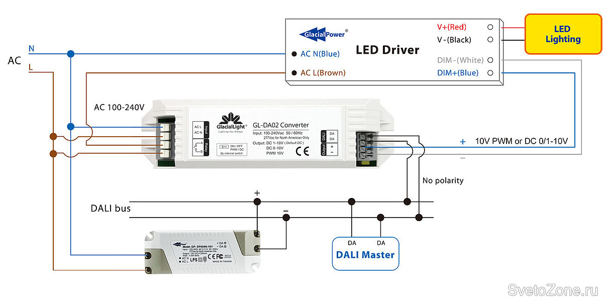 Согласно утвержденному международному стандарту все устройства DALI являются взаимозаменяемыми, что упрощает установку систем управления. Источник питания GP-DP004N-16V совместим с устройствами GlacialLight и другими брендами DALI, например конвертером GL-DA02 DALI с интерфейсом для LED-драйверов 1-10В в сетях DALI. Система DALI при питании от GP-DP004N-16V позволяет достигать общей протяженности по проводу до 300 метров при падении не более 2В на одной линии.