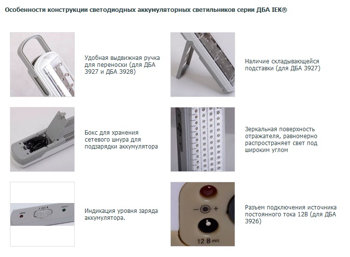 Светильники оснащены выдвижной ручкой для переноски; одна из моделей ДБА имеет складывающуюся подставку для удобной работы со светильником.