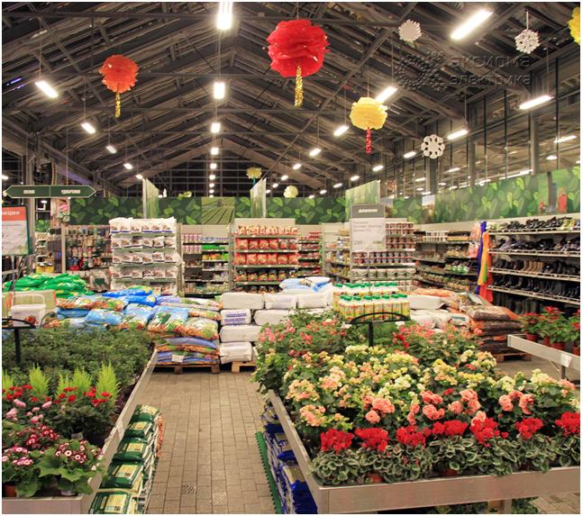 В качестве примера, демонстрируем проект освещения магазина по продажам садоводческих товаров. Для освещения торгового зала применили светильники серии СПО 70 W, теплым спектром излучения. Обеспечена необходимая освещенность при хорошем показателе коэффициента цветопередачи (CRI) >80. (фото освещения магазина).