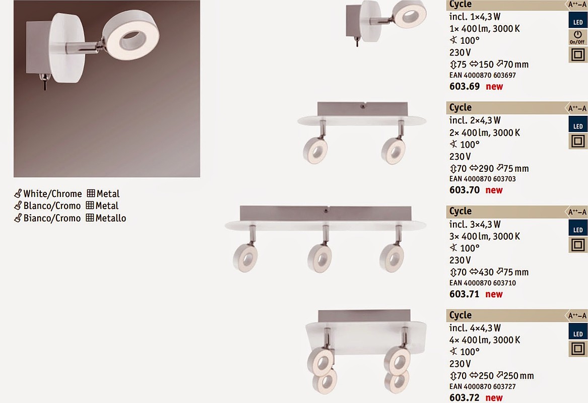 Далее следует целая серия светодиодных спотов, отличающихся уникальностью силуэтов. Довольно привлекательны, к примеру, белоснежный настенно-потолочный «нимб» Cycle (артикулы 60369-72), изящный «хрустальный» Curt (артикулы 60403-06) или невесомый «сетчатый» Mesh (артикулы 60407-10).