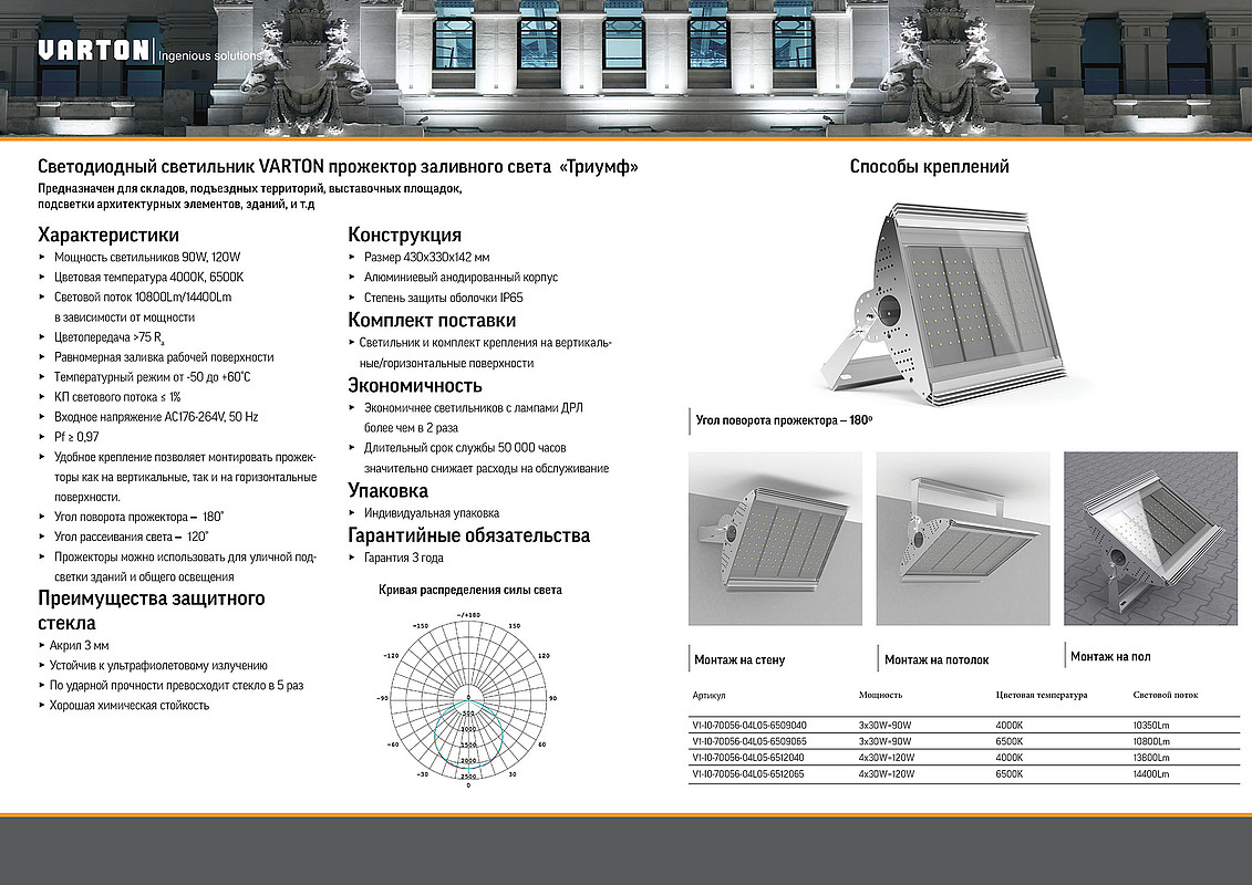 Светильник отличается мощным световым потоком с равномерной заливкой, а удобное крепление позволяет монтировать его как на горизонтальные, так и на вертикальные поверхности.