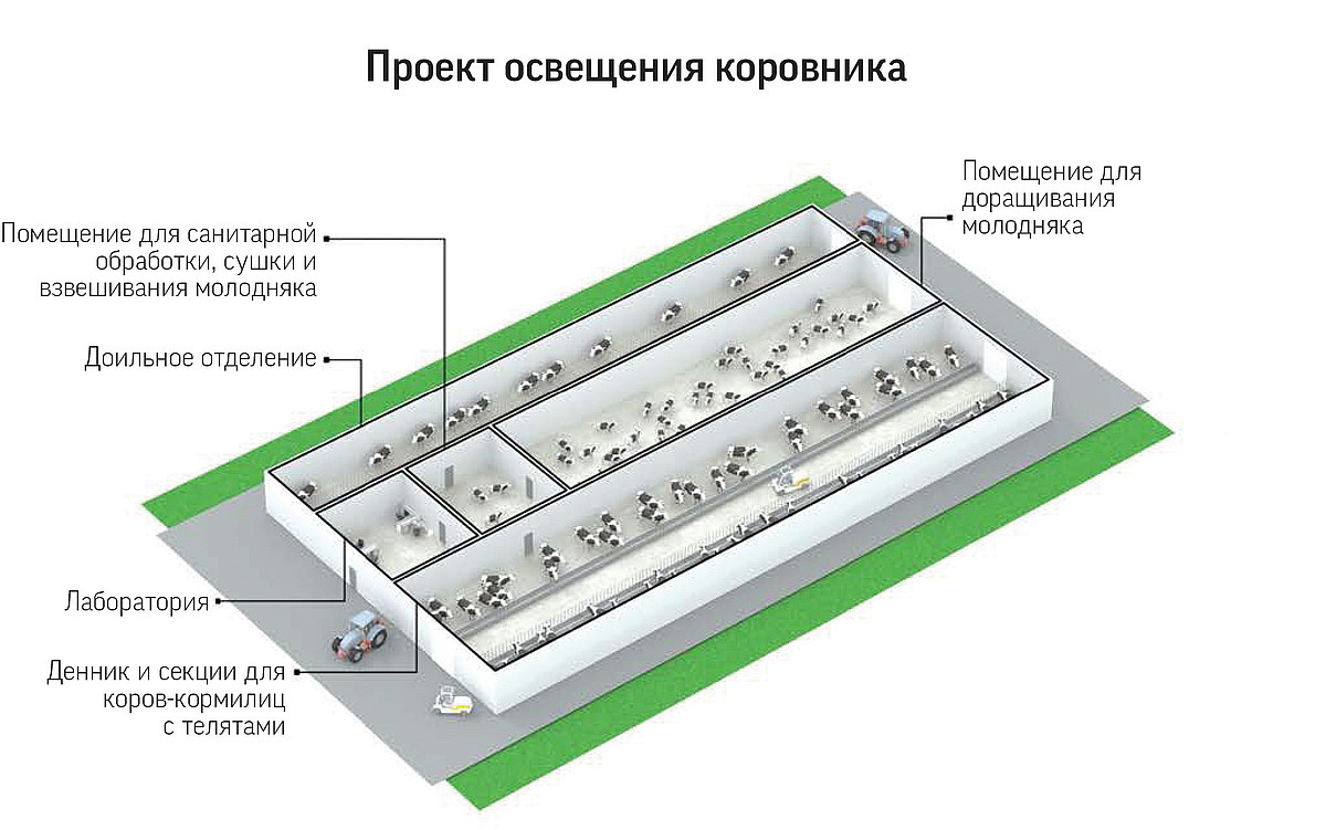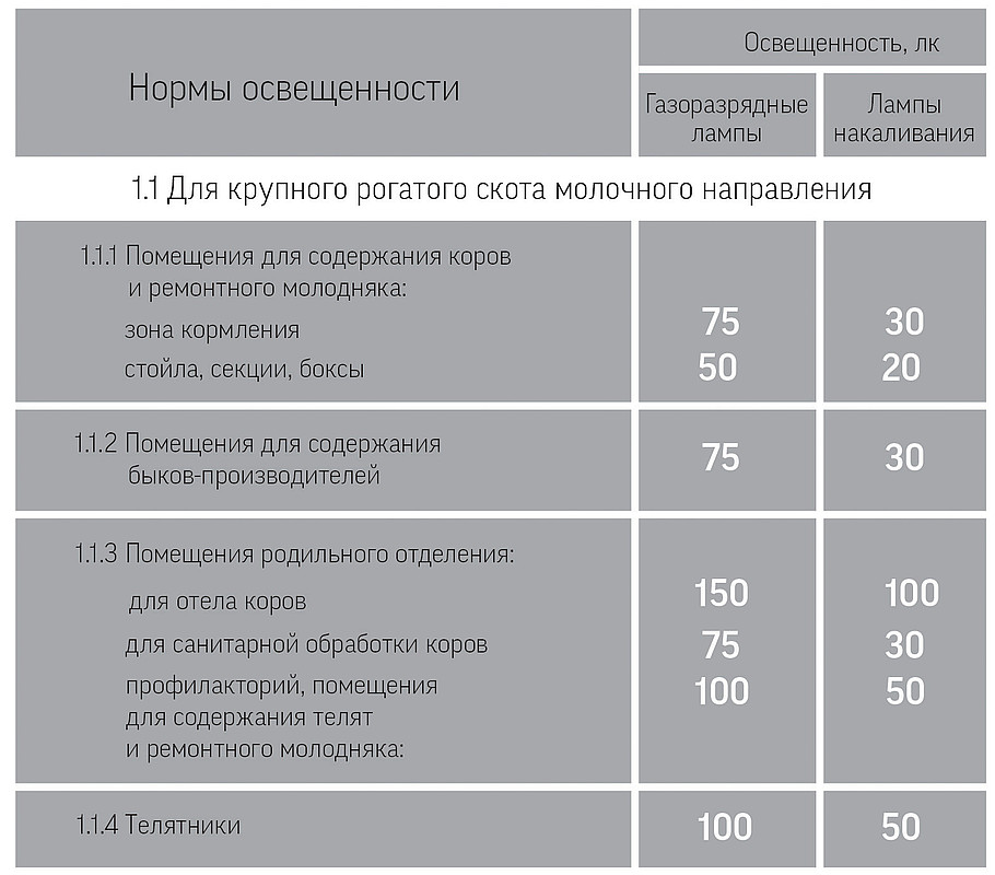 Оптимальный световой климат стимулирует рост, развитие и иммунитет животных. В то же время анализ существующих решений по освещению сельскохозяйственных помещений наглядно демонстрирует их низкую эффективность. Это связано с перерасходом электроэнергии из-за нерационального выбора и размещения осветительного оборудования или его неправильной эксплуатации. Предотвратить подобные последствия можно путем грамотного проектирования, при котором учитываются конструктивные особенности и назначение помещений, а также технология содержания конкретного вида животных. Эти данные обозначены в государственных нормативах искусственного освещения.