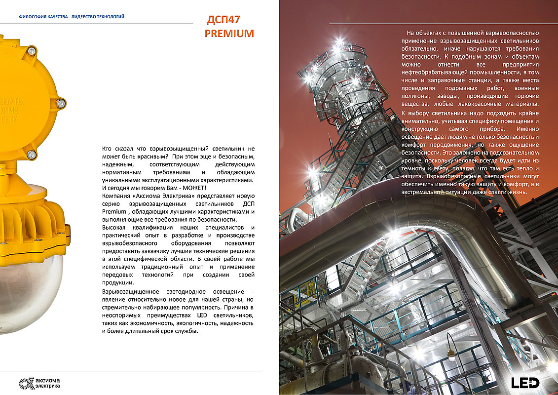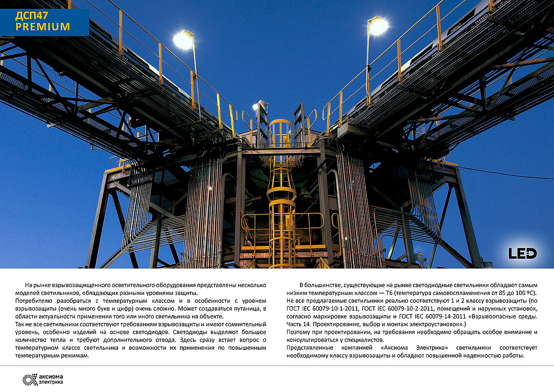 Компания «Аксиома Электрика» анонсирует выпуск взрывозащищенных светодиодных светильников серии ВЗГ- 200Д и ДСП47, которые предназначены для освещения взрывоопасных зон классов 1 и 2 по ГОСТ IEC 60079-10-1-2011, ГОСТ IEC 60079-10-2-2011, помещений и наружных установок, согласно маркировке взрывозащиты и ГОСТ IEC 60079-14-2011 «Взрывоопасные среды. Часть 14. Проектирование, выбор и монтаж электроустановок».