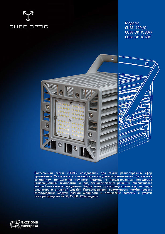 Светильники светодиодные серии «CUBE OPTIC» предназначены для освещения магазинов, офисов, промышленных зданий, складов и других объектов. Они незаменимы в местах, где требуется экономия электроэнергии, длительный срок службы и очень высокая надежность. Светильник обладает такими качествами, как: высокая светоотдача, бесшумность во время работы, отсутствие стробоскопического эффекта и вибрации, стабильность силы света во всем диапазоне питающих напряжений, устойчивость к внешним вибрациям, широкий диапазон рабочих температур и питающих напряжений, мгновенное включение даже при отрицательных температурах, значительный срок службы, превосходящий все аналоги. Для уличного использования светильник выпускается с уровнем пыле и влагозащиты IP65.