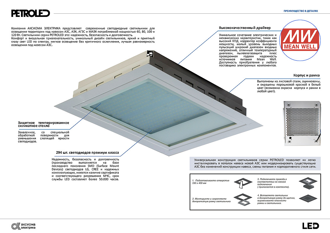Корпус и рамка светильника выполнены из листовой стали, оцинкованы и окрашены порошковой краской в белый цвет (стандартный). Защитное стекло закаленное, со специальной обработкой поверхности для уменьшения слепящей яркости светодиодов. Светильники производятся на базе светодиодов LG (294 шт.) с высокой световой отдачей более 140 Лм/Вт. Источники питания Mean Well. Светильники обладают уникальным дизайном, имеют специальную рамку для крепления в навес АЗС.