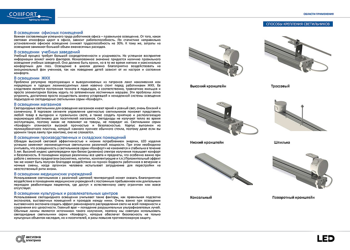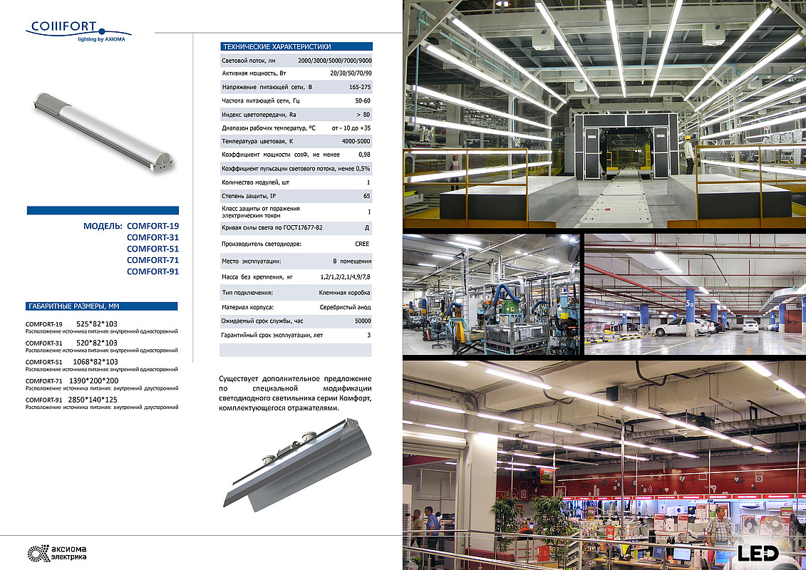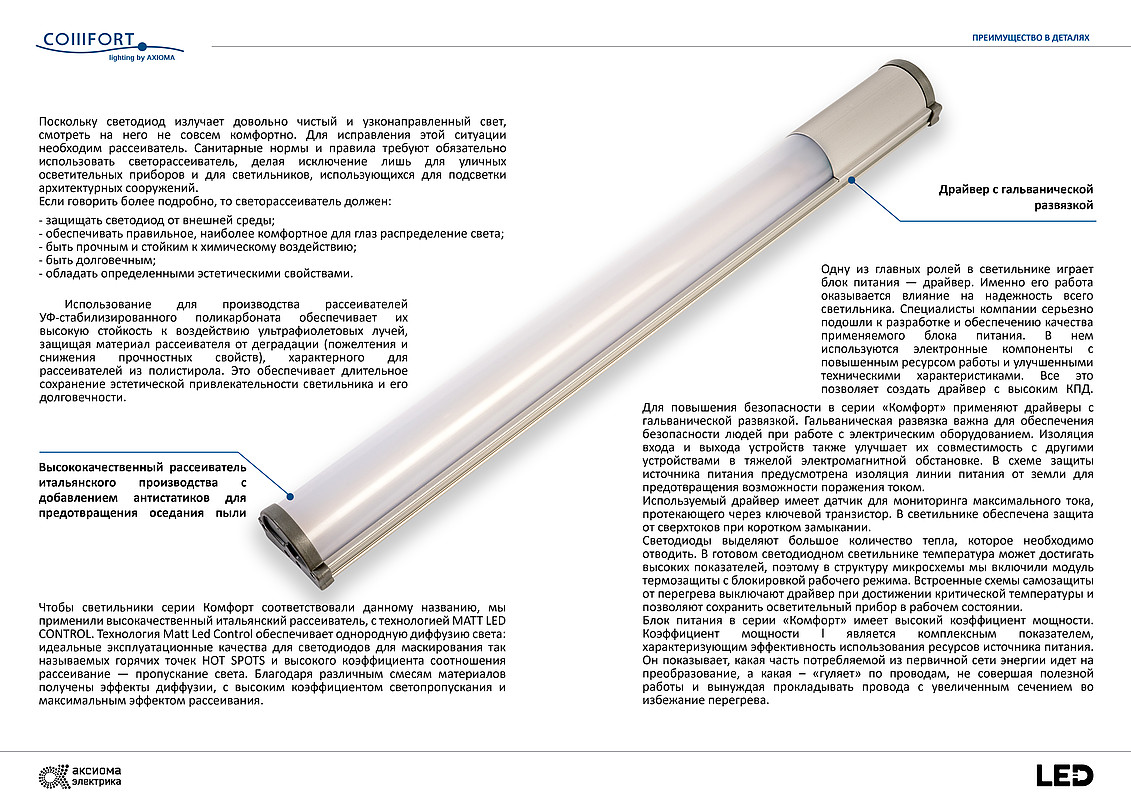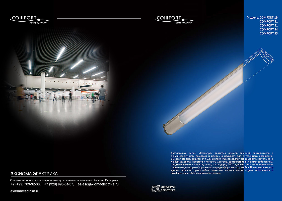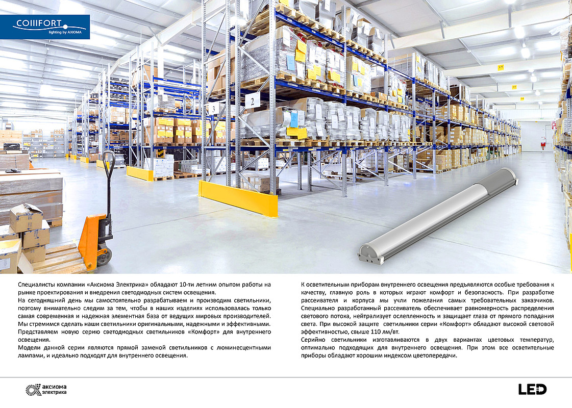 Серия «COMFORT» является прямой заменой светильников с люминесцентными лампами и идеально подходят для внутреннего освещения. Здесь для осветительных приборов выдвигают особые критерии к качеству, главную роль играют комфорт и безопасность. Поэтому при разработке светорассеивателя и корпуса, мы учли пожелания самых требовательных заказчиков. Специально разработанный светорассеиватель (матированный поликарбонат) обеспечивает равномерность распределения светового потока, нейтрализует ослепленность и защищает глаза от прямого попадания света. При высокой защите от прямого попадания света в глаза, светильники серии «Комфорт» при этом обладают высокой световой эффективностью, свыше 110 лм/вт. Серийно светильники изготавливаются в двух вариантах цветовых температур, оптимально подходящих для внутреннего освещения.