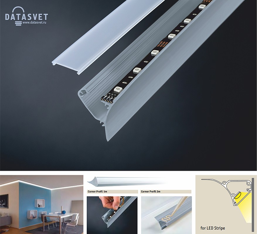 Светодиодные профили в новом каталоге, выполненные из алюминия с анодированной поверхностью, предназначены для создания особенных световых эффектов. Например, эффекта «парящего» потолка. Непрямая подсветка стены, с помощью этого декоративного потолочного профиля, обеспечивается яркой светодиодной лентой. Профиль крепится с помощью обычного строительного клея и не требует прокладки проводки. Все варианты светодиодных профилей и их принадлежностей на стр.: 221-225.