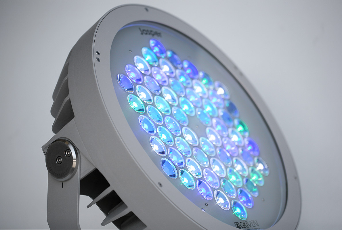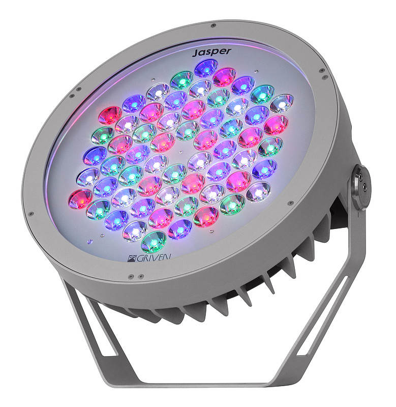 Новый мощный светодиодный прожектор в круглом корпусе. В зависимости от типа вторичной оптики может быть использован в качестве инструмента для общего заливающего освещения, или акцентного освещения узких протяженных поверхностей. Возможные углы луча – ультраспот (4°), спот, узкий, средний, широкий, экстраширокий, эллиптический, эллиптический широкий. В качестве источника света используется матрица из 60 светодиодов, общей мощностью 200 Вт. GRIVEN JASPER предлагается в следующих вариантах цветности – RGBW (колоченджер), WW (теплый белый), CW (холодный белый), DW (динамичный белый), монохром. Прожектор оснащается встроенным стабилизированным блоком питания и имеет степень защиты IP66. Управление осуществляется по протоколу DMX512, возможен автоматический режим работы, а также режим синхронной работы Master/Slave. Поддержка RDM. Управление режимами работы прибора может осуществляться при помощи ИК ПДУ. По специальному запросу прожектор изготавливается в модификациях POLAR EDITION и EASY EDITION.
