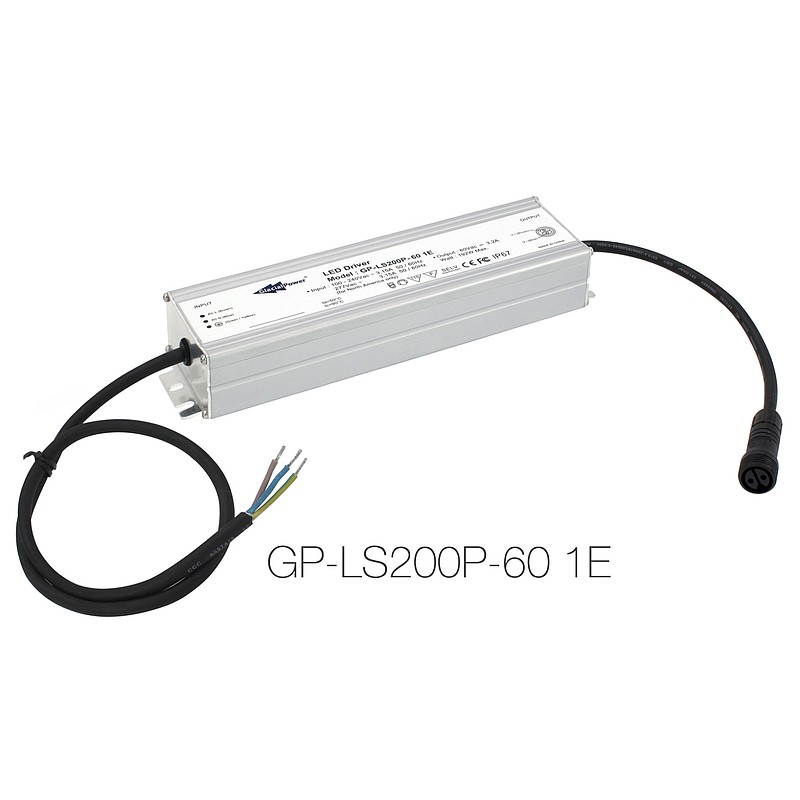 GP-LS200P-60 1E – это защищённый, надёжный, мощный и очень экономный блок питания для светодиодов. Диапазон входного напряжения составляет от 90 до 295 вольт переменного тока или от 127 до 417 вольт постоянного тока с частотой от 47 до 63 герц (расчётное напряжение от 100 до 277 VAC). Драйвер может работать в режиме постоянного тока или постоянного напряжения.