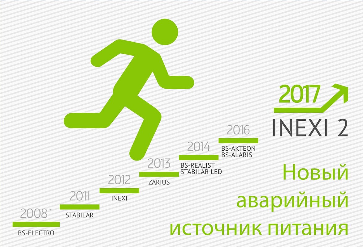 Основным источником питания в световых приборах аварийного освещения Технического решения №1 является электронная плата INEXI второй версии - INEXI2. Вторая версия электронной платы подверглась значительным улучшениям, которые продиктованы выходом новой нормативной базы, в частностиГОСТ IEC 61347-2-7-2014, а также в стремлении компании «Белый свет» предоставить потребителю продукцию высокого качества, превосходящую требования нормативной базы Российской Федерации. В зависимости от режима работы, источник питания INEXI2 имеет следующие модификации: