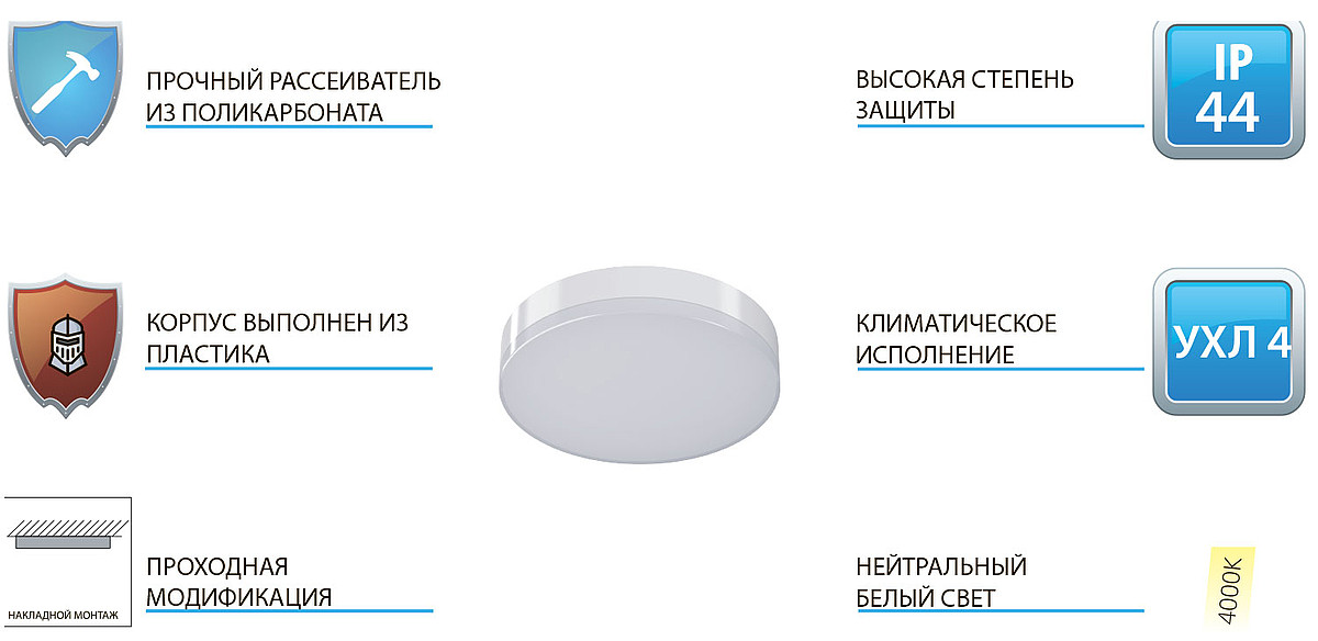 Светильники выполнены в пластиковых корпусах с повышенной защитой от воздействия окружающей среды - IP44.