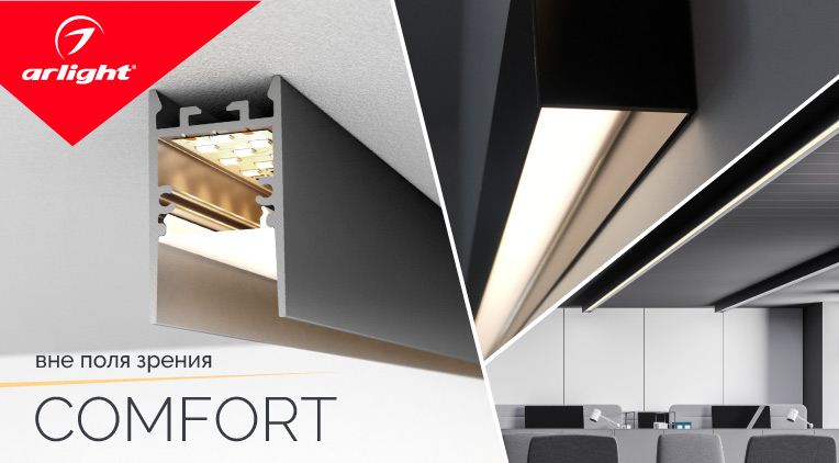 В серии COMFORT появился профиль с утопленным экраном, благодаря чему источник света скрыт от глаз, а освещение получается мягким и рассеянным. Такая техническая особенность позволяет располагать встроенные линии света или светильники на любой высоте и под любым углом — освещение всегда будет комфортным.