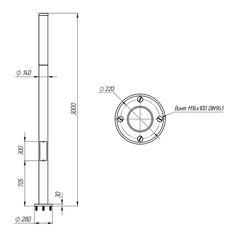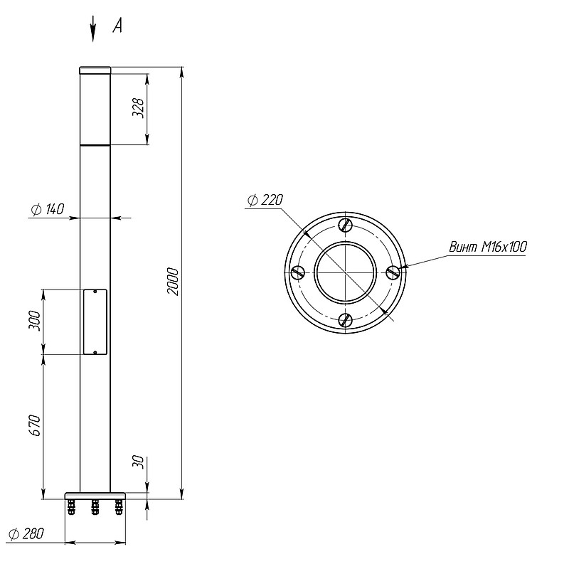 Монтаж выполняется на 4 потайных нержавеющих винта в бетонное основание или на мягкий грунт с закладной деталью. Закладная деталь фундамента приобретается отдельно.