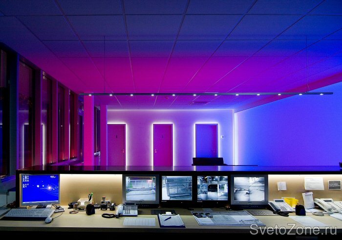 Рабочее пространство так же стало очень комфортным благодаря различным дизайнерским находкам и возможностям полупроводниковых светильников. Таким примером может служить подсветка рабочего стола и зоны мониторов.