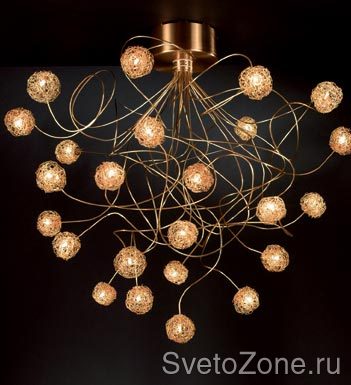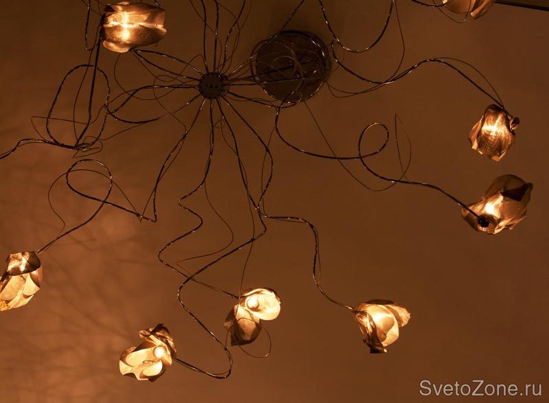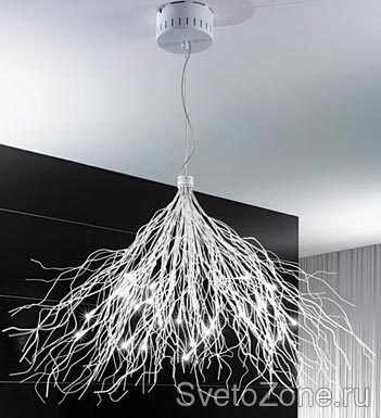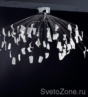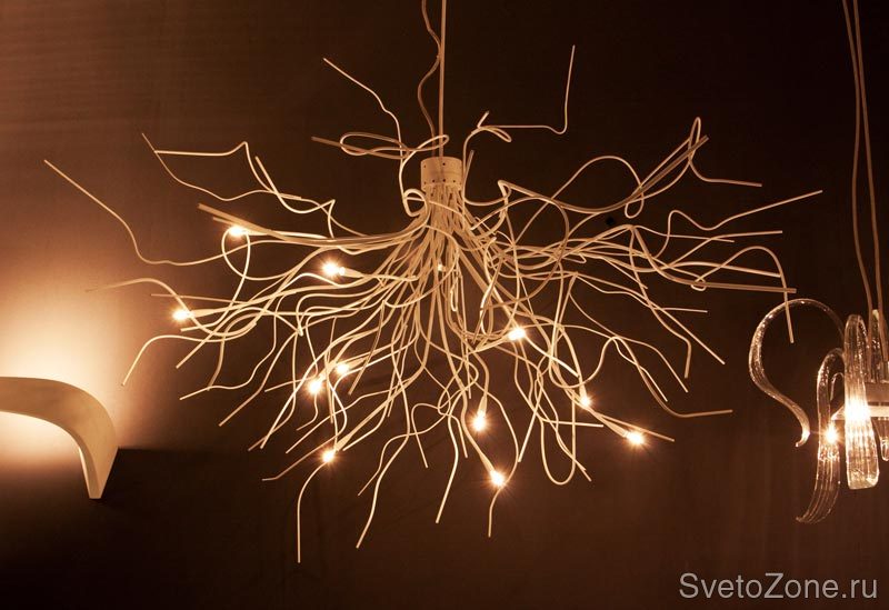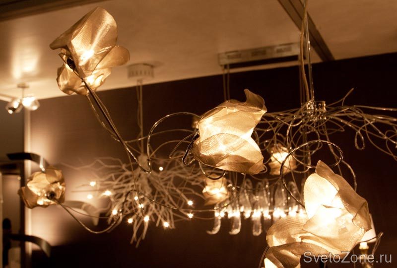 Серия Bouquet украшена нежными цветами, спускающимися на тонких медных проволочках, каждый из которых образуется металлической фактурной сеткой, напоминающей ткань. Форма светильника Saggina всегда индивидуальна - проволочная основа представляет возможность организации неповторимой композиции. Тонкие стебли Soffione заканчиваются сетчатыми клубками ручной работы. Соцветие Nulla si butta состоит из прямых хромированных веточек, на концах которых закреплены причудливые осколки белого, черного и цветного стекла. Неровные и полупрозрачные, вместе они складывают ощущение многослойности и воздушного пространства.