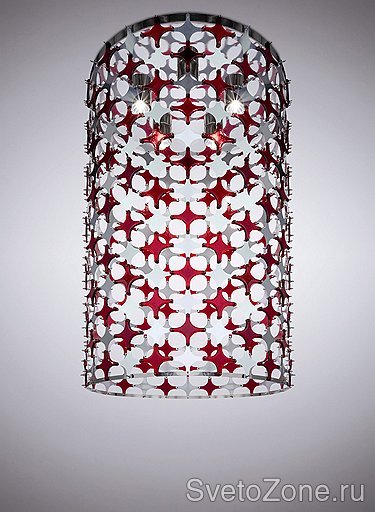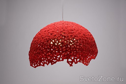 Начали дизайнеры с беспроигрышного красного. Его в светильниках больше всего — в чистом виде или в сочетании с белым. Что неудивительно: красный и его оттенки всегда активно использовались в освещении. Вспомните хотя бы традиционные лампы с абажуром из ткани и бахромой (кстати, его интересно обыграла марка Flos в своей модели Teca: абажур заточили в стеклянный куб и превратили в настольную лампу). Свет от таких ламп получается теплый и уютный, как от заходящего солнца,— то, что надо для гостиной или столовой. Одна из самых эффектных моделей этого жанра — Face to Face испанской марки Almerich. Абажур ее образуется за счет склеивания маленьких полосочек красного фетра. Выглядит лампа немного неуклюже, как будто ее сделали дети на уроке труда, а тень от нее получается ажурная и загадочная.