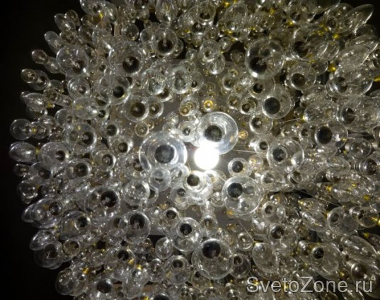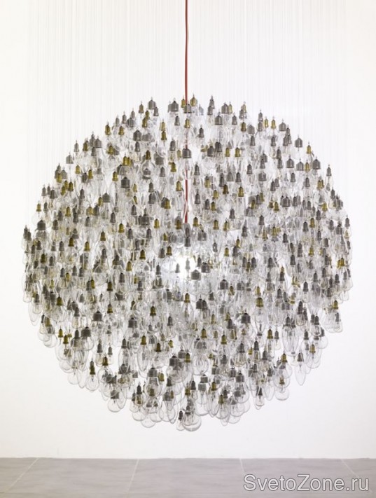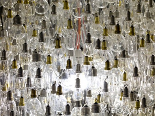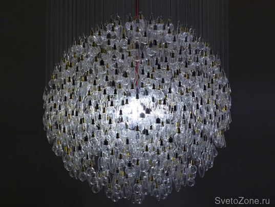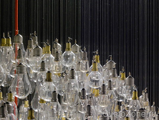 Дизайнер Тим Фишлок создал огромную люстру из 1243 старых, перегоревших ламп накаливания. Правда, ни одна из этих лампочек больше не светится. Все они придаются круглую форму, стеклянный абажур вокруг единственной горящей лампы. И эта горящая лампа, конечно же, - светодиод. Ведь именно за светодиодами будущее мирового освещения!