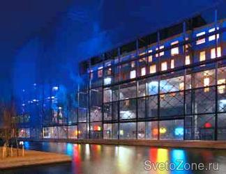 В вечернее время фасад оживает. Его верхняя часть – это гигантский дисплей, на котором динамические абстрактные сюжеты сменяются эпизодами из кинофильмов. Внизу, сквозь стеклянные стены видны разноцветные светильники фойе.