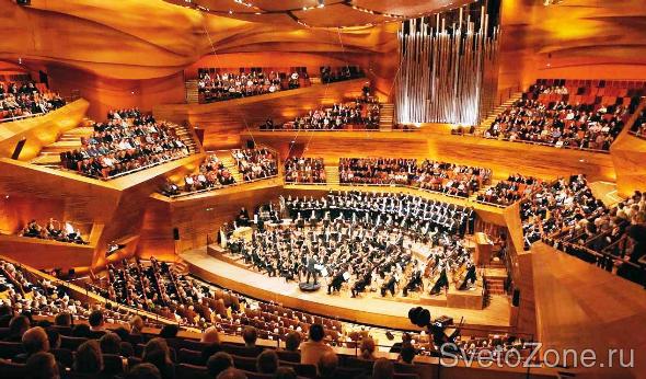 Общее освещение зала включает две компоненты: прямым светом освещается сцена, а преобладает отраженный свет – светильники с направленным излучением скрыты за причудливо изогнутыми панелями потолка.