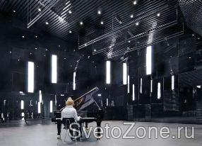 В зале фортепьянной музыки (Studio 3) вертикальные панели равномерной яркости (“Piano-Lights”) символизируют белые клавиши рояля.