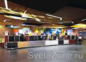 Интересна светоцветовая композиция интерьера фойе с гардеробом под главным залом. Потолочные световые «зигзаги» в комбинации с настенными светильниками “Concrete Lights” и Gobo-проекцией на потолке и стенах создают весьма необычную динамичную атмосферу в преддверии концерта.