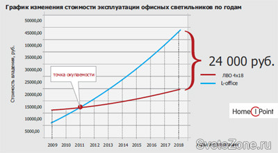 Для наглядности выгоды их использования специалисты компании сравнили светодиодный офисный светильник L-office и стандартный офисный встраиваемый светильник на люминисцентных лампах серии ЛВО 4x18. Данные светильники имеют аналогичные параметры по степени освещенности на поверхности. В расчете показана динамика изменения стоимости светильников по годам на период 10 лет.