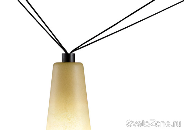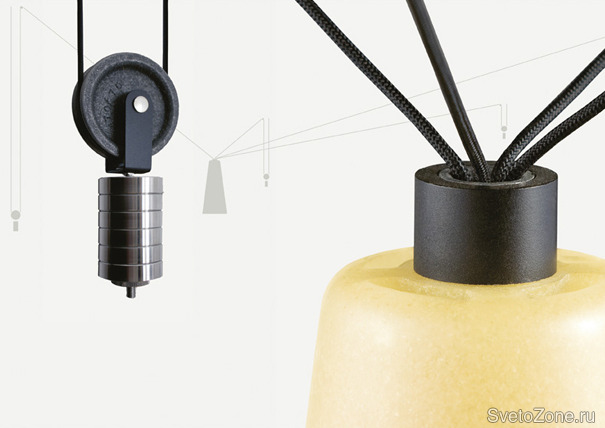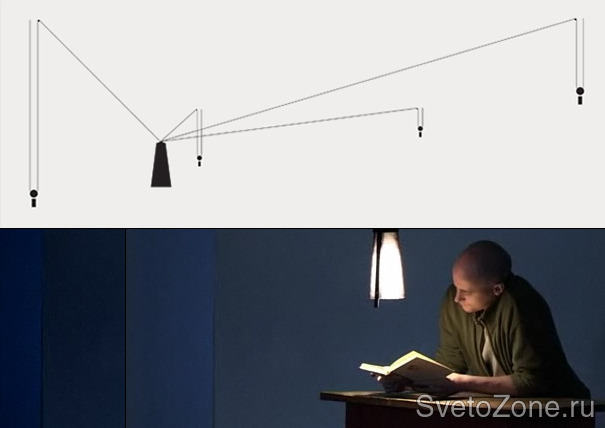 Оригинальная лампа, используемая, прежде всего, для местного освщения, держится на пересечении четырёх шнуров, которые в свою очередь закреплены в разных точках студии и снабжены противовесами. Если вы сменили местоположение, просто потяните лампу вслед за собой, зафиксируйте и занимайтесь своими обычными делами!