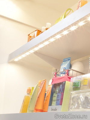Светодиодная подсветка полок становится все популярнее в гипермаркетах, поскольку она выступает и как целевая, и как акцентная. И здесть тонкие низкопрофильные модульные 12-волььтные светильники GE представляются идеальным решением, поскольку возможны различные длины, углы обзора и монтажные углы. Эти решения легко интегрировать во множество проектов, адаптируя их и к бюджетным требованиям.