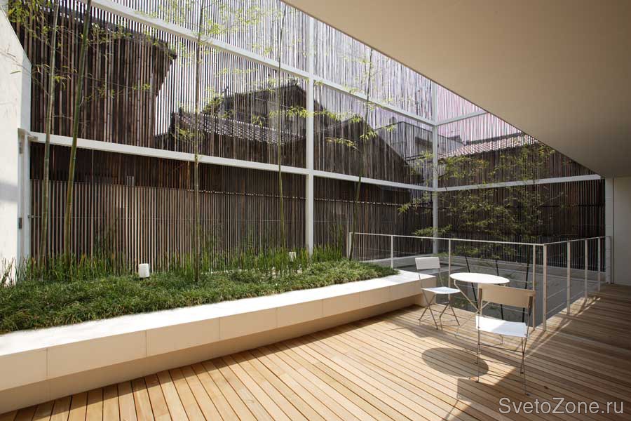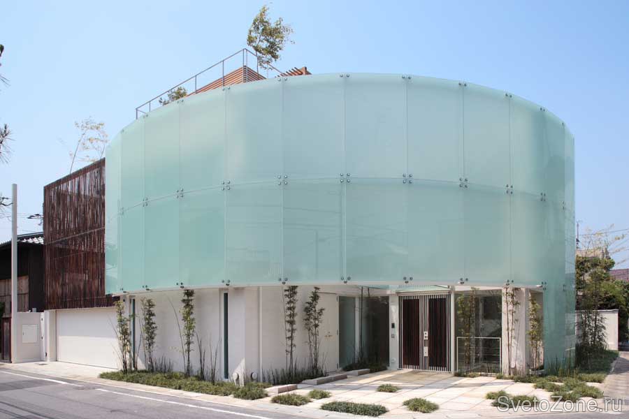 В доме два больших экрана. Один, со стороны улицы, сделан в форме круга из листов матового стекла. Мягкий, полупрозрачный, зеленоватый свет обеспечивает конфиденциальность второго этажа дома. Второй экран-ширма – во дворе, со стороны соседей, выполнен из бамбука, пропускает через себя силуэты соседних зданий и обеспечивает необходимый контакт с соседями, сохраняя, в то же время, минимальную приватность. На крыше дома расположена терраса, с которой открывается панорама Киотских гор.
