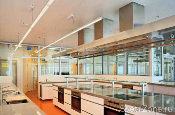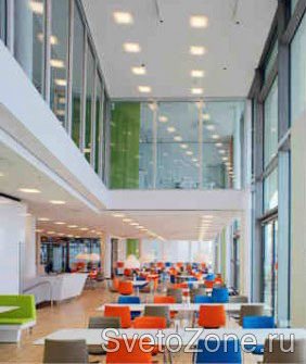 Для освещения столовой персонала на двух уровнях служат встроенные в подвесной потолок светильники серии “Modul Q”.
