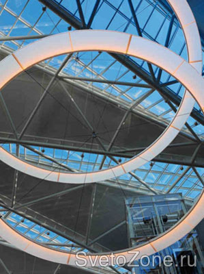 Эти гигантские светящиеся кольца подвешены к конструктивным связям купола атрия на коническом пучке стальных тросов.