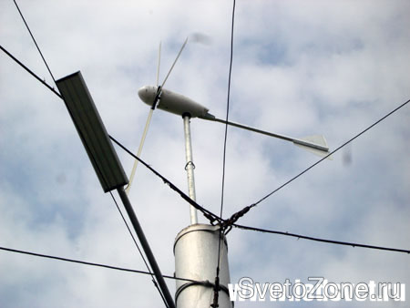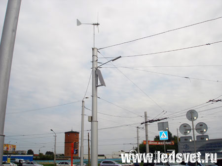 На осветительной мачте установлен ветрогенератор вырабатывающий 200 ватт; солнечная батарея генерирующая 150 ватт и светодиодный светильник УСС 70/100 потребляющий всего 70 ватт.