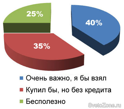 35% посетителей сайта посчитали, что программа льготного кредитования не будет определяющим фактором в процессе принятия решения при совершении покупки энергосберегающих ламп. Данная группа респондентов заменят лампы накаливания на энергосберегающие, не пользуясь предложенными кредитами.