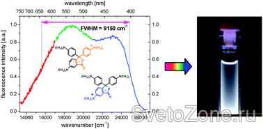 Исследователи из группы Карпюка наблюдали излучение белого света, реализовавшееся во всей спектральной области видимого света. Источником излучения был кристаллический фиолетовый лактон [crystal violet lactone (CVL)], вещество, которое производится в промышленных масштабах и используется при изготовлении копировальной бумаги в качестве прекурсора красителя. В составе молекулы CVL имеется две флуорофорные группы, одна из которых излучает синий свет, а другая - оранжевый. Вклад каждой из групп в общую эмиссию CVL зависит от окружения молекулы, влияющего на энергию возбужденных состояний молекулы. Исследователи отмечают, что изменение окружения молекулы позволяет менять характеристики спектра эмиссии, получая, в том числе, и белый свет.