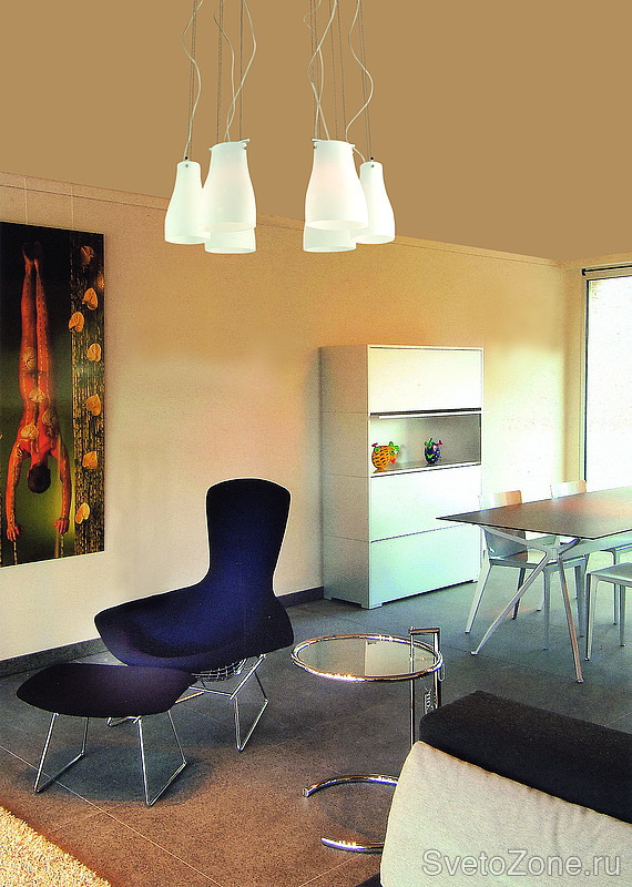 Уникальность этой люстры состоит в том, что от закрепленного основания можно расположить плафоны на нужном Вам расстоянии и в любой конфигурации (круг, квадрат, змейка и т.д.), максимально на 850 мм. Высота каждого плафона регулируется, максимально 1200 мм.