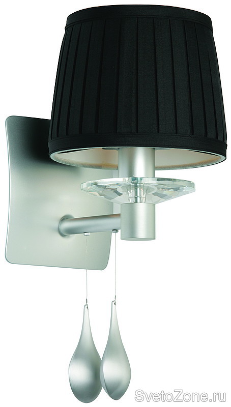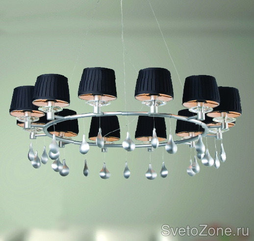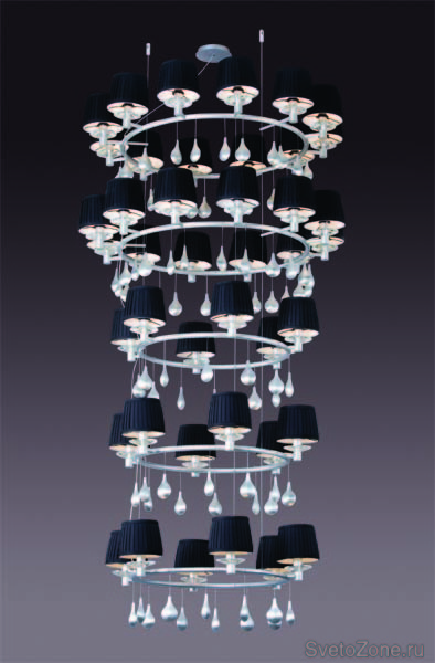 Плафоны, обтянуты тканью черного (бежевого) цвета в сочетании с алюминиевым основанием и подвесами в виде застывших серебряных капель.