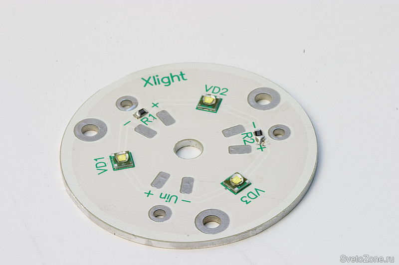 Кластер представляет собой круглую печатную плату на алюминиевом основании с 3 мощными светодиодами серии XP-E. Кластер адаптирован к применению для трех светодиодов.