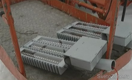 "Этот светильник весит гораздо больше обычных, он тяжелее раза в три привычных наших. Как поведет себя, посмотрим", - рассказал мастер участка наружного освещения МП "Горэлектросеть" Олег Позин.