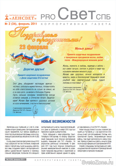 Февральский выпуск корпоративной газеты "PRO Свет СПб"На корпоративном сайте предприятия «Ленсвет» опубликована интернет-версия корпоративной газеты "PRO Свет СПб" №2 (34).