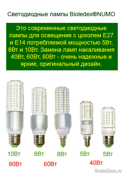 Светодиодные лампы BIOLEDEX® серии NUMO – это лампы нового поколения в виде кукурузного початка, предназначенные для замены ламп накаливания с цоколем Е27 и с цоколем Е14 мощностью 40, 60 и 90 Вт. В 2010 году лампы светодиодные серии NUMO были модифицированы – охлаждающий радиатор стал больше, что сделало эти лампы еще более надежными. И над внешним видом светодиодных ламп серии NUMO поработали немецкие дизайнеры – лампы BIOLEDEX® серии NUMO стали узнаваемыми и стильными.