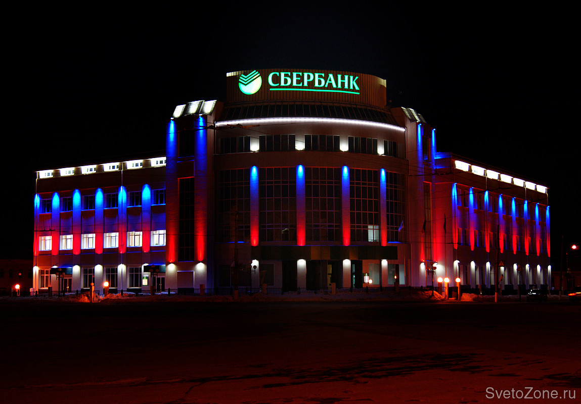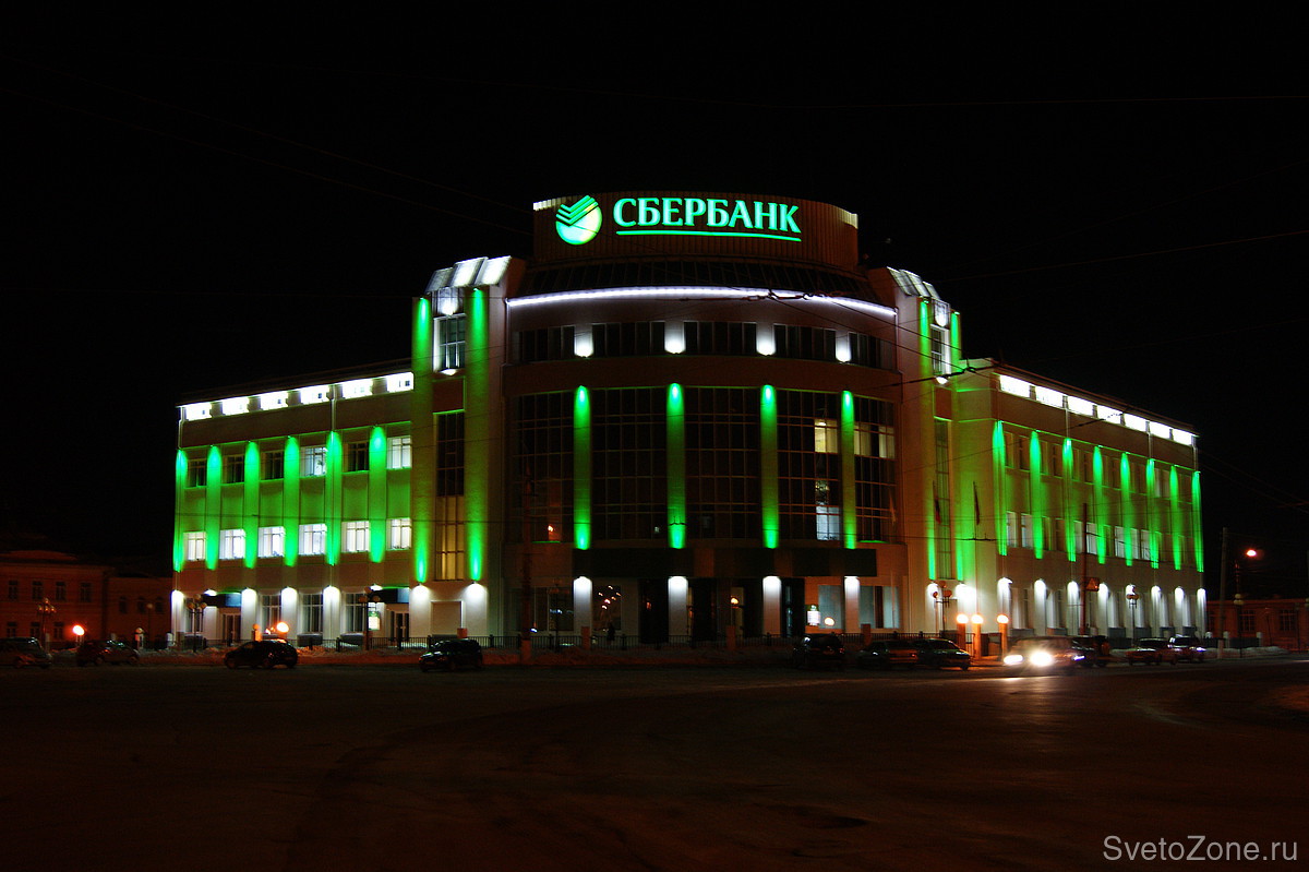 Оборудование "IntiLED" в архитектурной подсветке Сбербанка РФ, г. Тула.