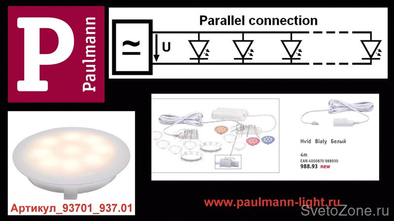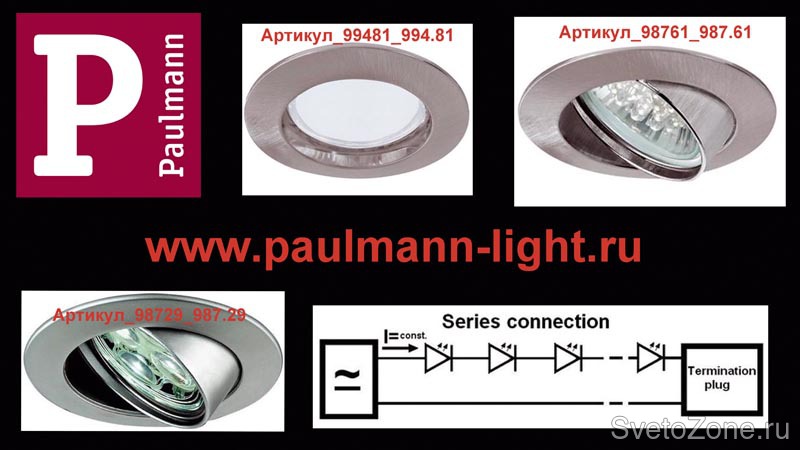 Для светильника требуется постоянное рабочее напряжение. Обычно оно составляет 12V или в случае с лампой (цоколь- GU10) – 230V.Для работы светодиодов требуется постоянный ток. Поэтому в случае переменного тока в лампы обычно интегрирован ректификатор. Эти лампы могут подключаться как к индуктивному, так и к обычному трансформатору .Для моделей без ректификатора требуется специальный контроллер постоянного тока. 12V-модули можно диммировать ( с возможностью подключение диммера).Примеры: В линейке продукции компании Paulmann (Паулман) они представлены в сериях встраиваемых светильников — Profi Line UpDownlight, Profi Line Mini, Profi Line Micro.
