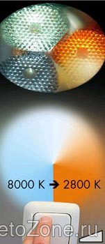 Изменение цвета достигается путем интеграции трех одно-ваттных высокопроизводительных светодиодов в 1 светильник. Контроль за переключением каждого цвета в отдельности позволяет менять цвет светильника в целом.
