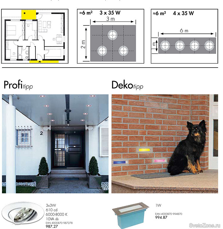 Для освещения площади в 6 кв.м. достаточно установить 3 (при желании четыре) светильника с лампами, мощностью по 35W.