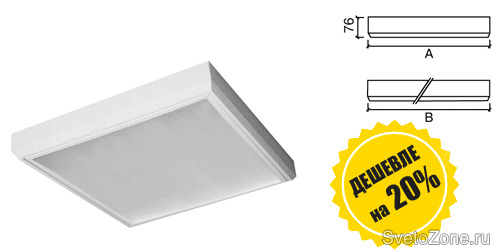 Потолочный светильник с призматическим рассеивателем. Корпус выполнен из листовой стали, покрыт термореактивной краской. Пускорегулирующая аппаратура установлена в корпусе.