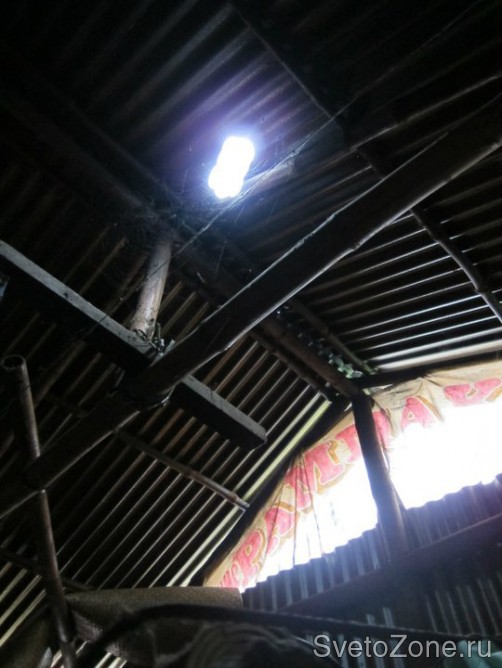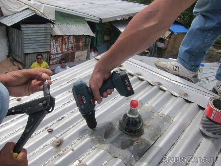 Крышка герметизируется той же замазкой, и жестянка с бутылкой закрывают собой небольшой разобранный участок крыши. Меньше часа работы, и светильник готов работать до пяти лет: вода рассеивает лучи по всему помещению, бутылка светит как лампочка на 50-60 ватт.