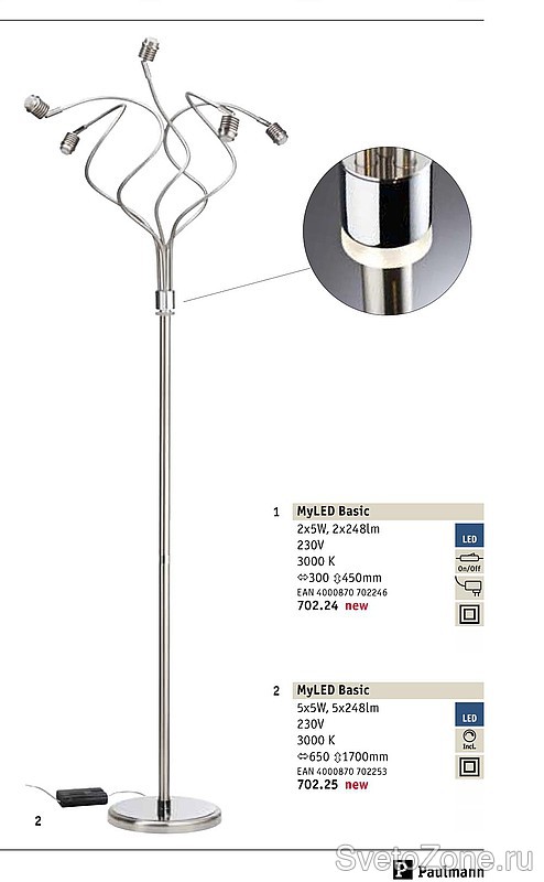 В каталоге серия представлена – Настольная лампа (артикул – 702.24), Торшер (артикул – 702.25), Подвесной светильник на круглом основании на 5 ламп (артикул – 702.26), Подвесной светильник – линейка из 5 ламп (артикул – 702.27).