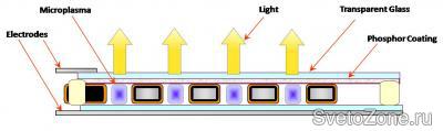 Г-на Идена заинтересовало следующее. Как известно, чем меньше объём, в который заключена плазма, тем выше должно быть давление, чтобы она оставалась в стабильном состоянии. Соответственно, очень высокое давление, необходимое для «микроплазмы», может привести к излучению в видимом диапазоне. В размышлениях об этом и родилась идея микрополостного массива (micro-cavity array, MCA). Как и в случае с флуоресцентным светом, MCA находится под напряжением. Экспериментируя с «укладкой» плазмы в параллельных рядах микрополостей, Иден и Пак в конце концов получили очень тонкие и гибкие светящиеся листы.