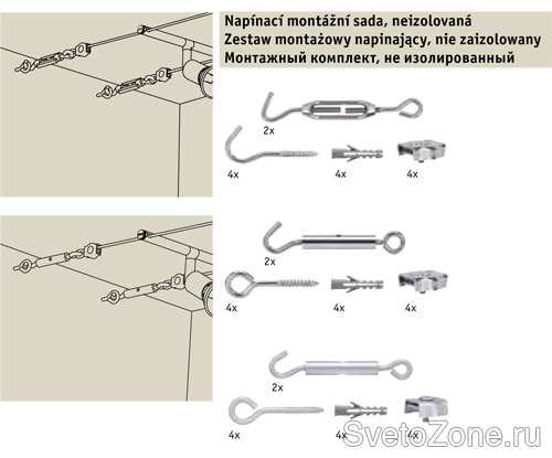 Варианты крепления тросовой системы – стены, потолок с помощью направляющих (арт.178.06), отвесов для прикручивания (арт.972.86), присоединения к стене (арт.178.08) и т.д.